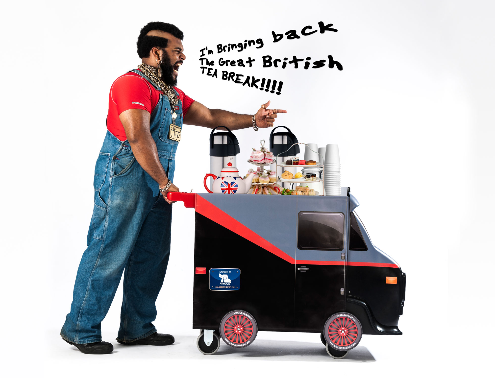 Como se ha visto en Britain's Got Talent y como parte del famoso acto Chippendoubles, este doble de Mr. T ofrece una forma única de entretenimiento perfecta para eventos corporativos, funciones, fiestas privadas y más. Equipado con su carrito de té temático del Equipo A, Mr. T está reviviendo la gran pausa del té británico ofreciendo a los invitados una selección de deliciosos aperitivos y bebidas (calientes o frías) que se pueden personalizar para adaptarse a una variedad de eventos. Mr. T también está disponible para eventos de encuentro y saludo y puede estar acompañado por Major Trouble, su oficial al mando femenina de mano derecha vestida con uniforme militar de estilo de los años 1950.