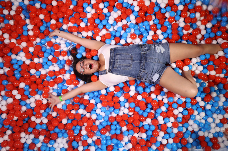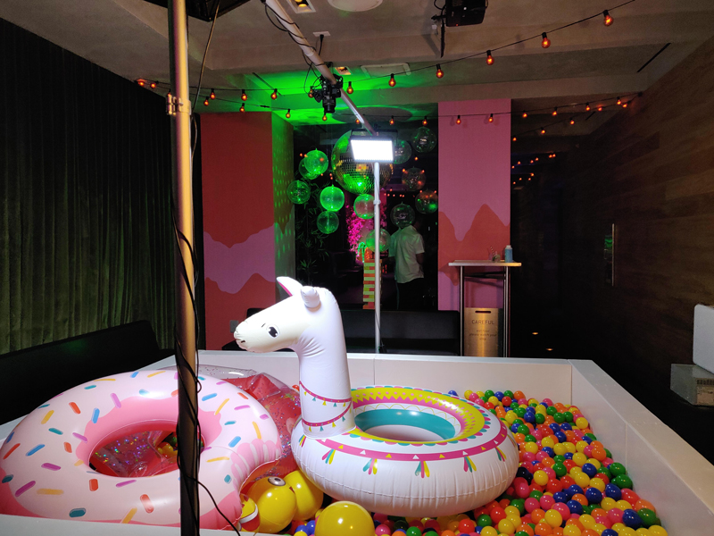 El ball pit se puede personalizar con pelotas de diferentes colores y también con accesorios LED e inflables, como se puede ver en las imágenes a continuación.