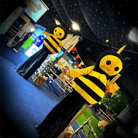 Con coloridos trajes de abeja, estos dos encantadores zancudos temáticos garantizan llamar la atención y sacar sonrisas en cualquier evento