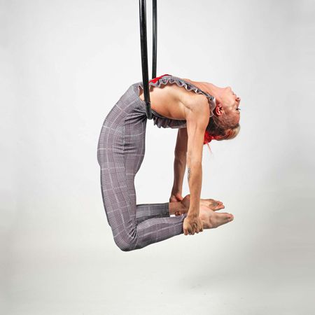 Observa con asombro cómo nuestro acróbata aéreo se eleva en el aire, creando hermosas formas que demuestran una impresionante fuerza y flexibilidad.