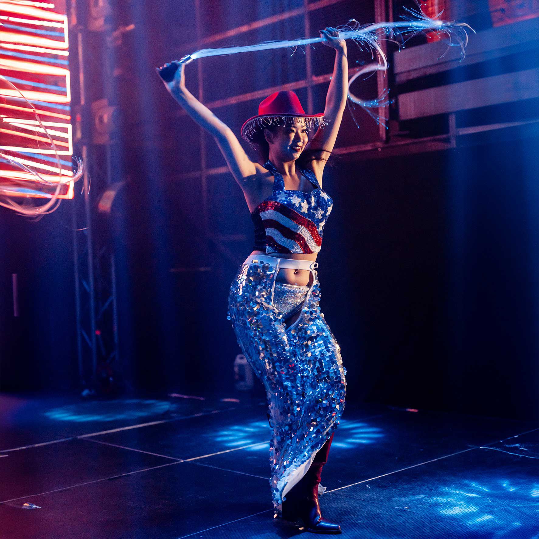 Nuestro grupo de talentosos bailarines realiza rutinas coreografiadas que involucran látigos LED para darle un giro divertido al entretenimiento country tradicional.