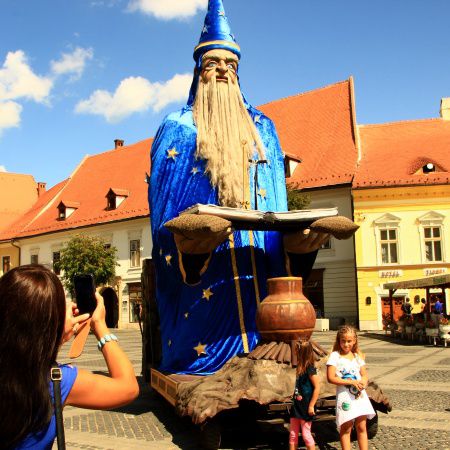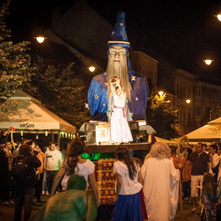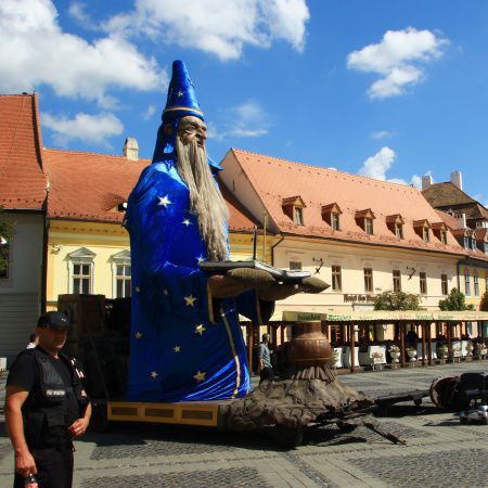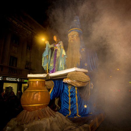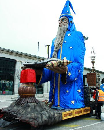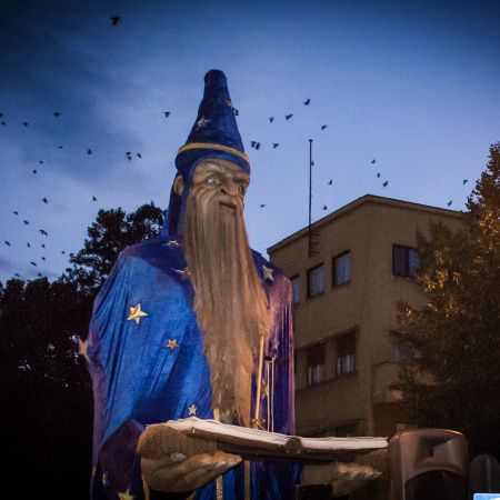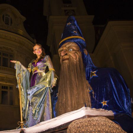 Nuestra Figura de Mago Gigante se desliza graciosamente por tus calles, llevando a un artista en su libro de hechizos abierto para saludar y cautivar a los espectadores.