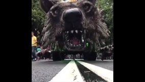 Con una altura de 2,7 metros, este lobo es una impresionante adición a desfiles por sí mismo o puede ser acompañado por bailarines y artistas de circo.