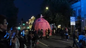 La Grande Madame es un acto de desfile o caminata extravagante y de gran tamaño que asombra por completo a las audiencias. La dama vestida gigante flota con gracia por la calle en su falda de gran tamaño inspirada en la moda glamorosa de mediados a finales del siglo XVIII. Este acto de caminata de alto impacto llama la atención y hace que los espectadores saquen sus teléfonos.