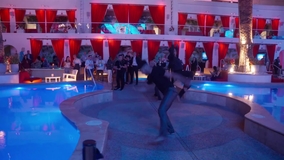 Este flash mob único tiene bailarines que comienzan una actuación en tierra antes de saltar a la piscina y continuar la actuación en el agua.