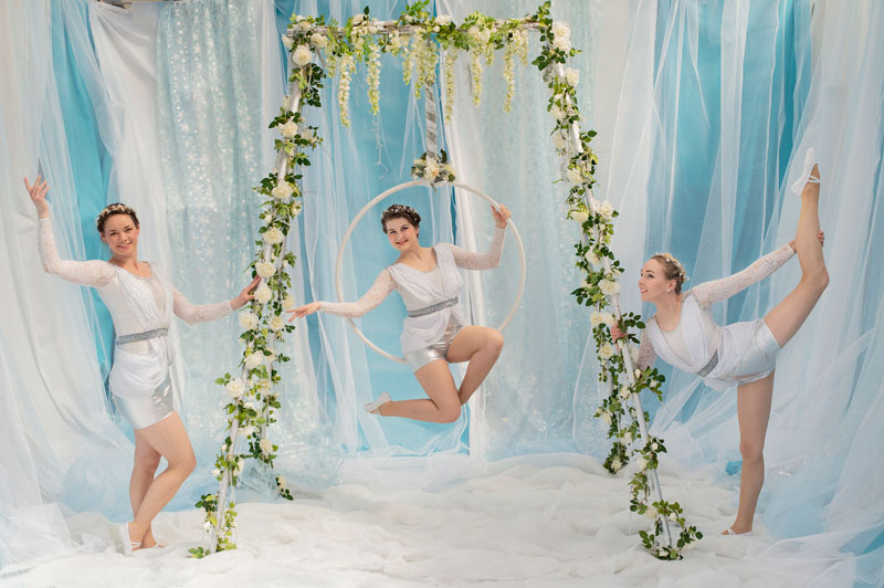 Realizando rutinas exquisitas en aro aéreo, nuestras artistas aéreas de invierno muestran proezas de equilibrio, fuerza y flexibilidad mientras crean formas hipnotizantes en su aro aéreo.