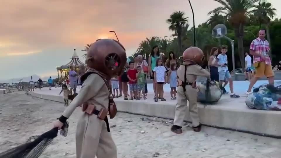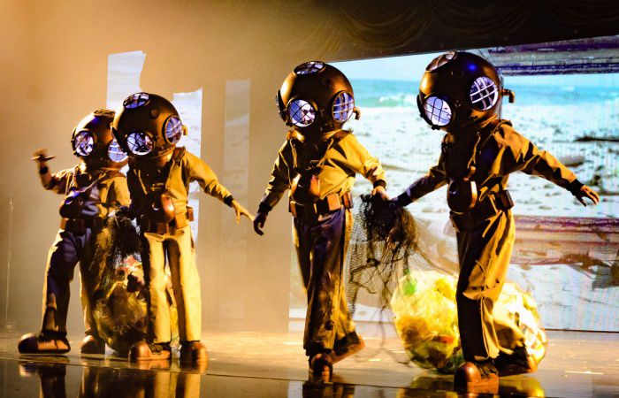 Vestidos con trajes de buceo de la década de 1880, nuestros buceadores llevan cascos iluminados que emiten los suaves sonidos del océano y arrastran redes llenas de basura detrás de ellos.