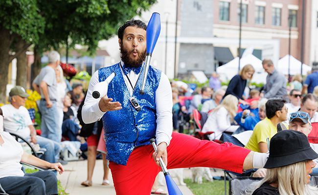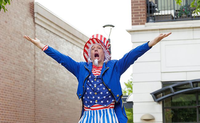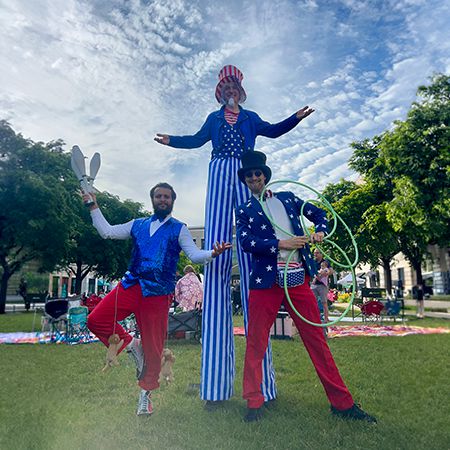 Disponible en todo el país, este artista zancudo con temática de EE. UU. crea actuaciones memorables para fiestas del 4 de julio y una variedad de otras ocasiones.