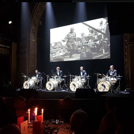 Un tributo a la batería de Gene Krupa que transporta a los invitados a los días de gloria de Hollywood y Las Vegas —el espectáculo de percusión ideal para cualquier ocasión. Rindiendo homenaje al legendario músico de jazz Gene Krupa, este grupo de cuatro bateristas ofrece una actuación dinámica y tremendamente impresionante.
