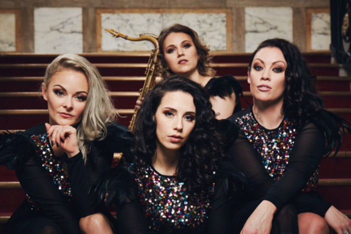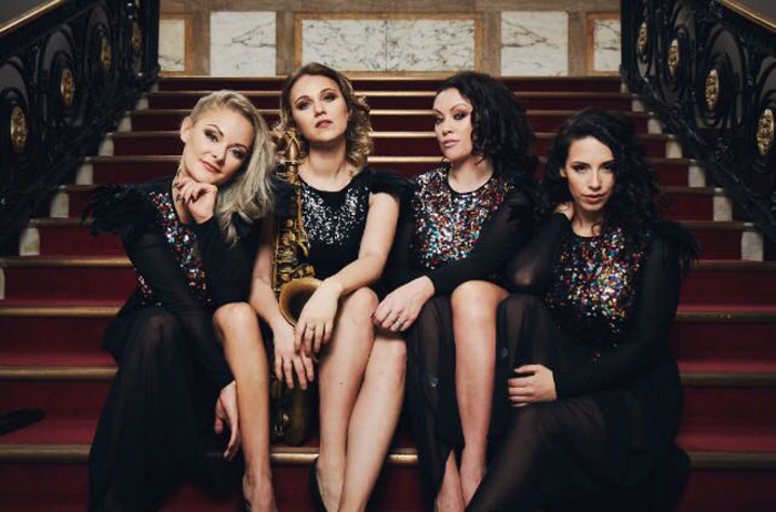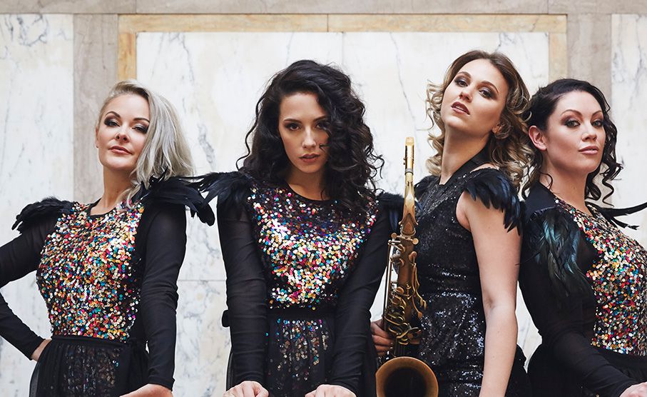El trío vocal femenino con saxofón de cuatro piezas está formado por tres brillantes cantantes femeninas y un saxofonista en vivo. Juntos, crean un espectáculo musical en vivo visual y sonoramente emocionante que los diferencia de una banda de eventos estándar. Son una excelente opción de música en vivo para cualquier evento que no pueda acomodar una banda en vivo completa, ya que el saxofonista y las cantantes femeninas aún ofrecen un espectáculo en vivo.