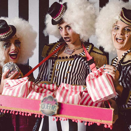 Nuestro acto itinerante es perfecto para romper el hielo, entretenimiento después de la cena, fiestas privadas, festivales o simplemente para divertirse un poco, nuestras anfitrionas de eventos temáticas de circo pueden servir algodón de azúcar, dulces y palomitas de maíz, así como la opción de repartir sus propios productos o artículos promocionales.