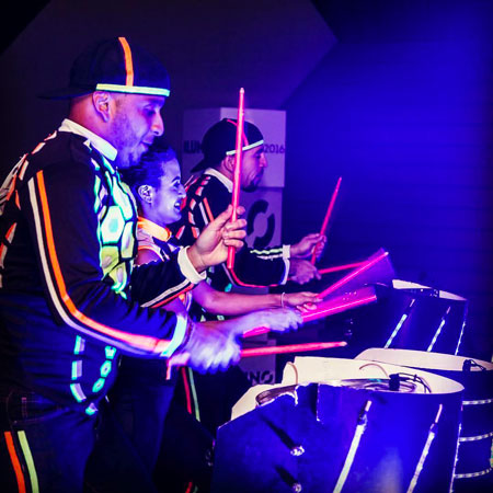 Realizando movimientos coreográficos con sus baquetas mezclados con trajes fluorescentes y luces LED que se proyectan al ritmo de la música, nuestros UV Drummers Panamá brindan entretenimiento de alto octanaje en cada evento.