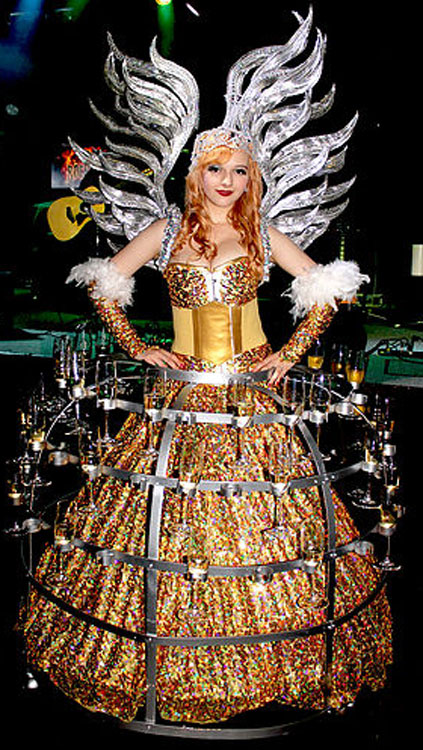 Un vestido de champagne que es usado por nuestra impresionante camarera ambulante es un espectáculo para contemplar mientras se desliza con gracia por la habitación luciendo un glamoroso vestido de gala completo con una elegante jaula que imita la forma de su falda para sostener aproximadamente 20 botellas de 750 ml de bebida.