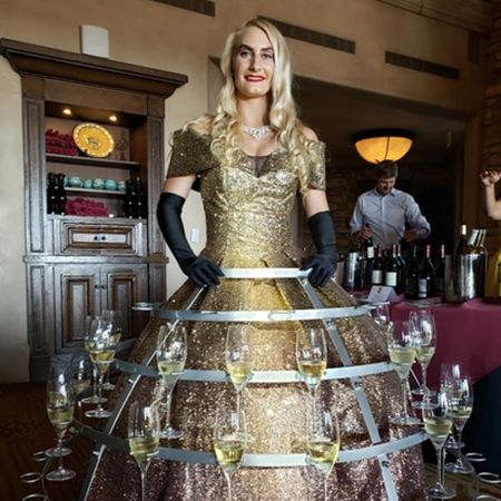Nuestra anfitriona viene con un asistente para ayudar a que el proceso de servicio sea fluido y asegurarse de que el vestido siempre esté lleno de bebidas.
