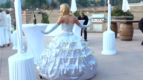 Los vestidos están disponibles en dorado o plateado y cada uno puede contener 60 copas de champán y son adecuados para lugares con superficies planas.