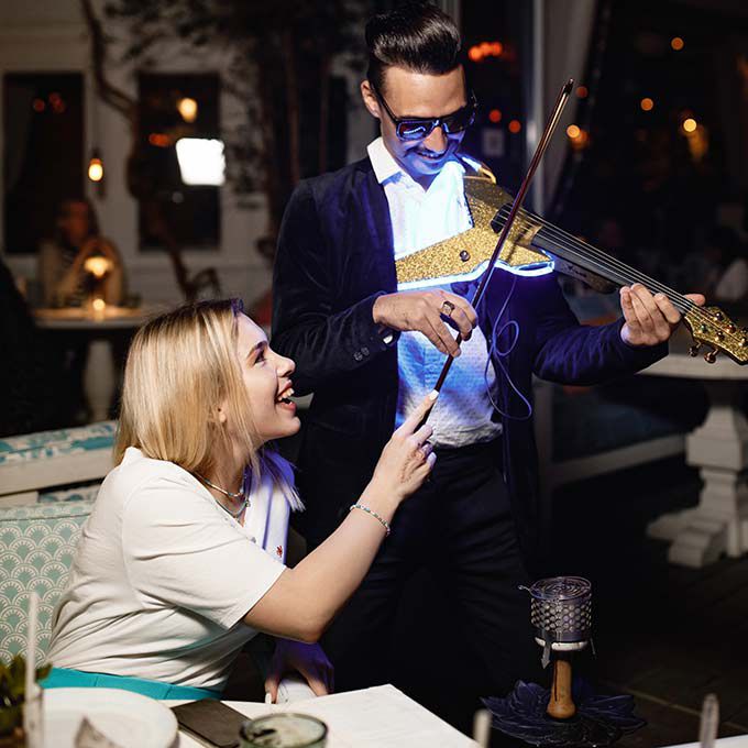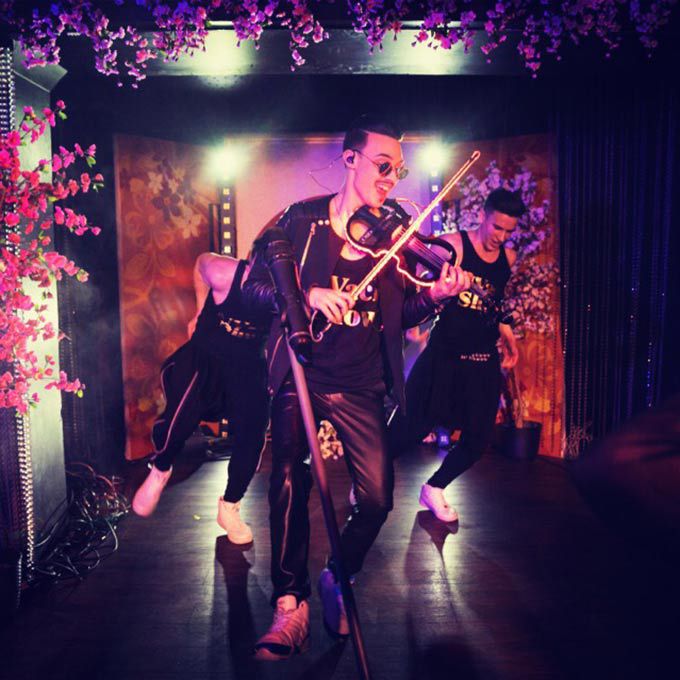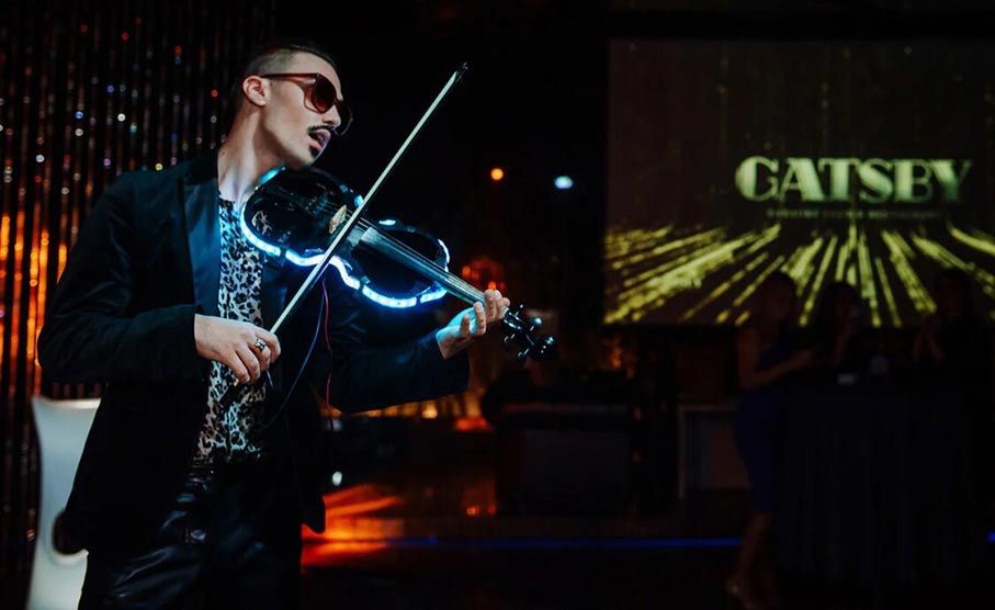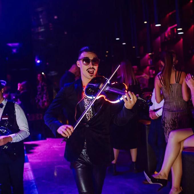 No solo es un DJ excepcional, también puede tocar el violín LED, para darle un toque futurista a esta actuación en vivo del DJ contemporáneo.