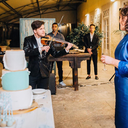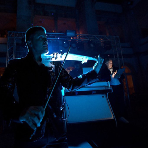 También se presenta en su violín eléctrico iluminado con LED para iluminar su evento y llevarlo desde la recepción de cóctel hasta el evento principal.