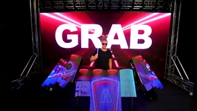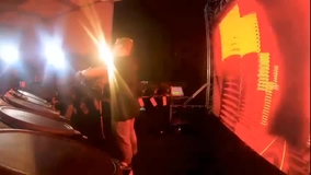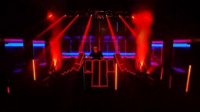 DJ remixes y realiza interpretaciones en vivo de canciones populares en tambores LED mientras activa gráficos intensos y visuales personalizados en una pared de video HD.
