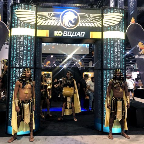 El equipo egipcio KO Squad buscaba la forma de atraer visitantes a su stand en la feria Joe Weider's Olympia Fitness & Performance Weekend. KO Squad representa a los atletas más prometedores de Egipto, por tanto,  ¿qué mejor manera de impresionar a los visitantes que con un impactante grupo de batería con un toque egipcio? Nuestros Drumbots LED de Las Vegas personalizaron su explosiva actuación con disfraces egipcios. Vestidos como faraones y maquillados al estilo egipcio, nuestros percusionistas desfilaron por el Centro de Convenciones de Las Vegas guiando a los visitantes hasta el stand de KO Squad.