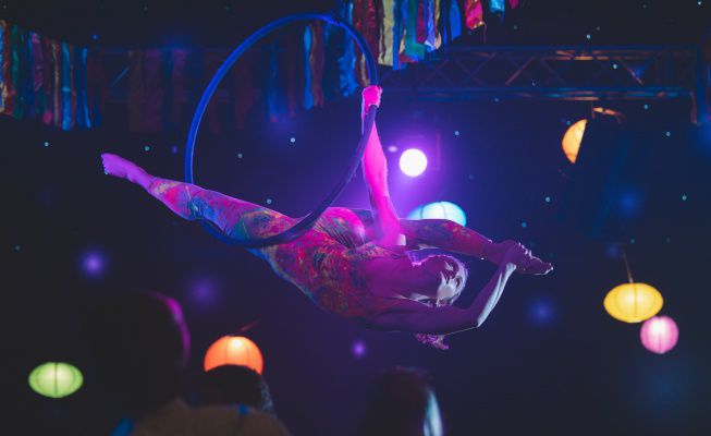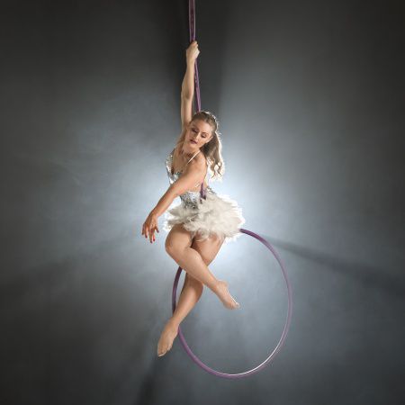 Notre artiste aérienne présente une gamme variée de compétences, y compris le cerceau aérien, les sangles, les tissus, la toile espagnole et se produit également sur un accessoire autoportant
