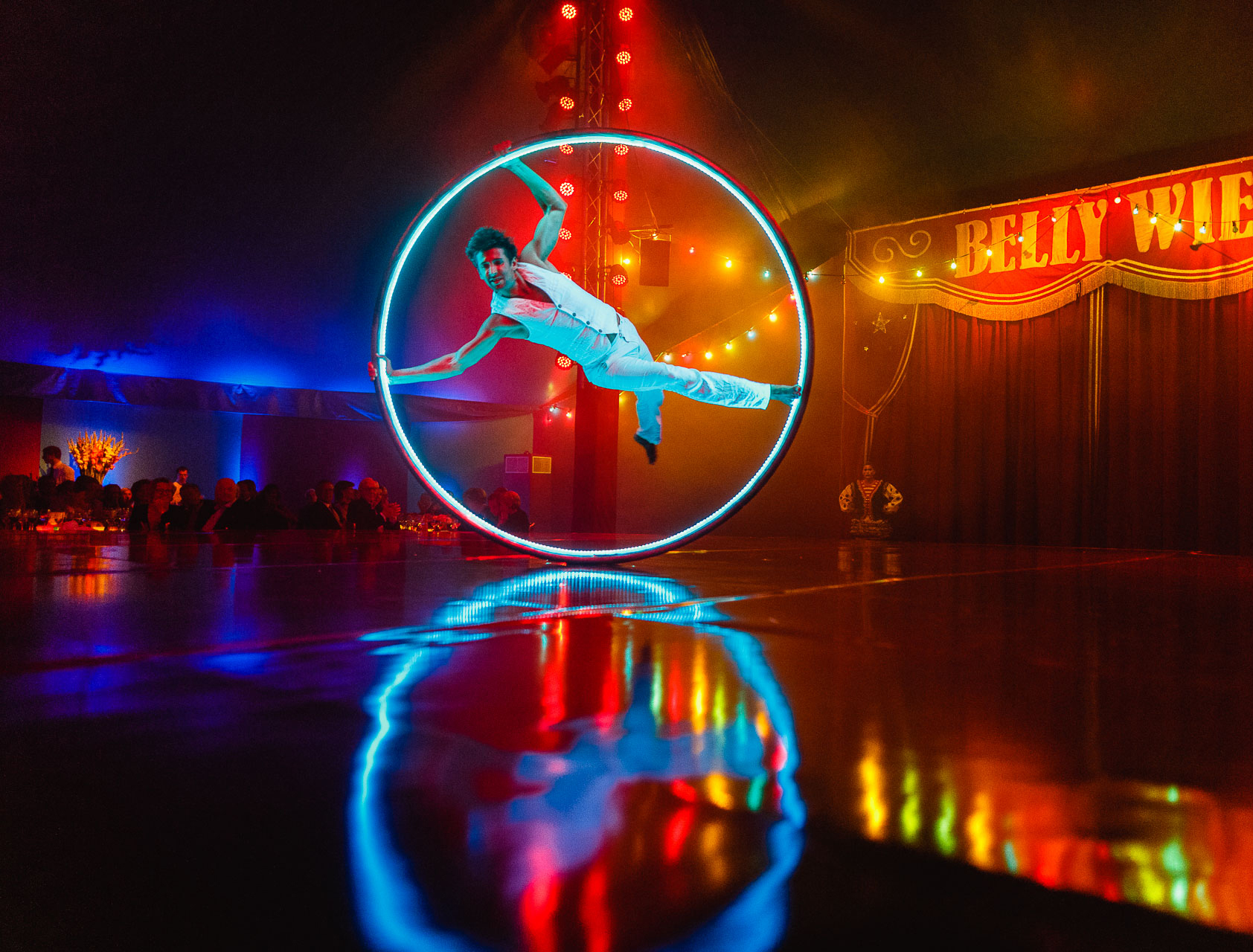 Pour réserver notre audacieux numéro de Roue Cyr ou pour plus d'informations, contactez nos Spécialistes du Divertissement.