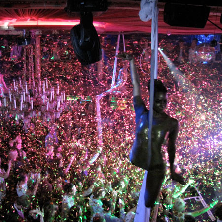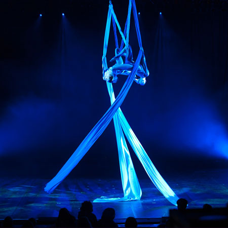 - Solo sur tissu : Démontrant force et élégance, ce spectacle classique de tissu aérien combine des positions gracieuses avec des chutes dramatiques