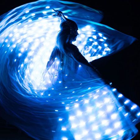 Elle propose une variété de numéros LED, y compris des ailes LED, des cerceaux, des éventails et des poi, offrant un mélange polyvalent de performances lumineuses visuellement époustouflantes.
