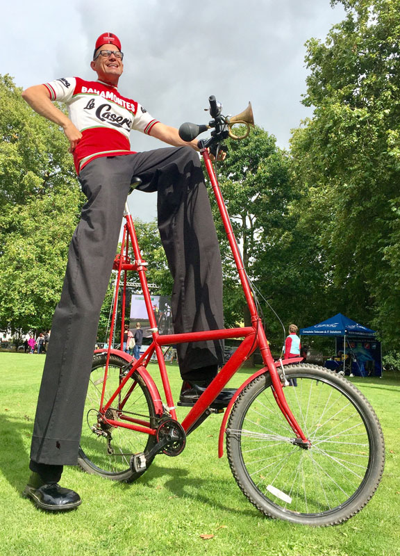 Marchant haut au-dessus de la tête de vos invités, nos talentueux artistes sur échasses se mêleront aux passants tout en circulant sur leur VTT spécialement modifié lors de votre événement.