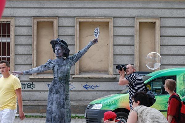 Notre Dame Statue Vivante s'exprime à travers le mime et le théâtre masqué, interagit avec les passants et crée un tourbillon d'excitation lors des événements.