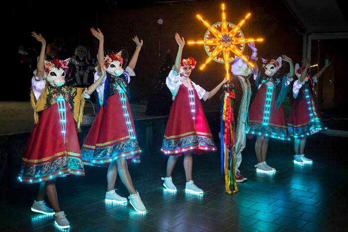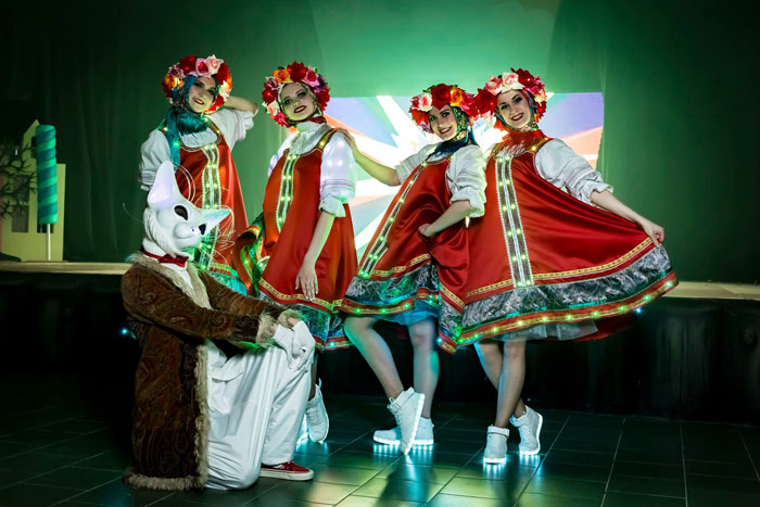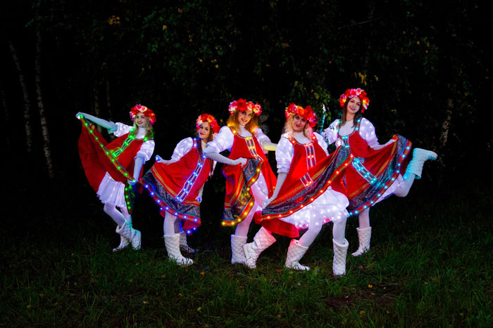 Nos danseurs russes sont incontournables et inoubliables. Avec un choix de trois à cinq belles danseuses, elles sont habillées de magnifiques costumes folkloriques vibrants avec de magnifiques coiffes florales. Les élégantes chorégraphies de danse incluent également l'utilisation de quelques accessoires fascinants. De plus, les costumes peuvent être illuminés avec des éclairages LED incroyables qui impressionneront le public.