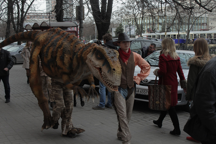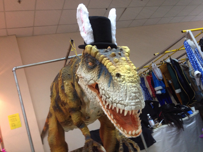 Ce fantastique numéro déambulatoire est un personnage en costume d'un incroyable Tyrannosaurus Rex, mais à petite échelle. Le dinosaure ambulant est toujours accompagné d'un manipulateur qui peut être déguisé dans une variété de costumes, du cowboy à Jack Sparrow. Le personnage en costume incroyablement réaliste semble tout droit sorti de Jurassic Park ou ramené du futur. Avec une peau rugueuse, des dents acérées, des yeux mobiles et des sons édités de l'intérieur, ce numéro déambulatoire apporte une touche de surréalisme partout où il va.