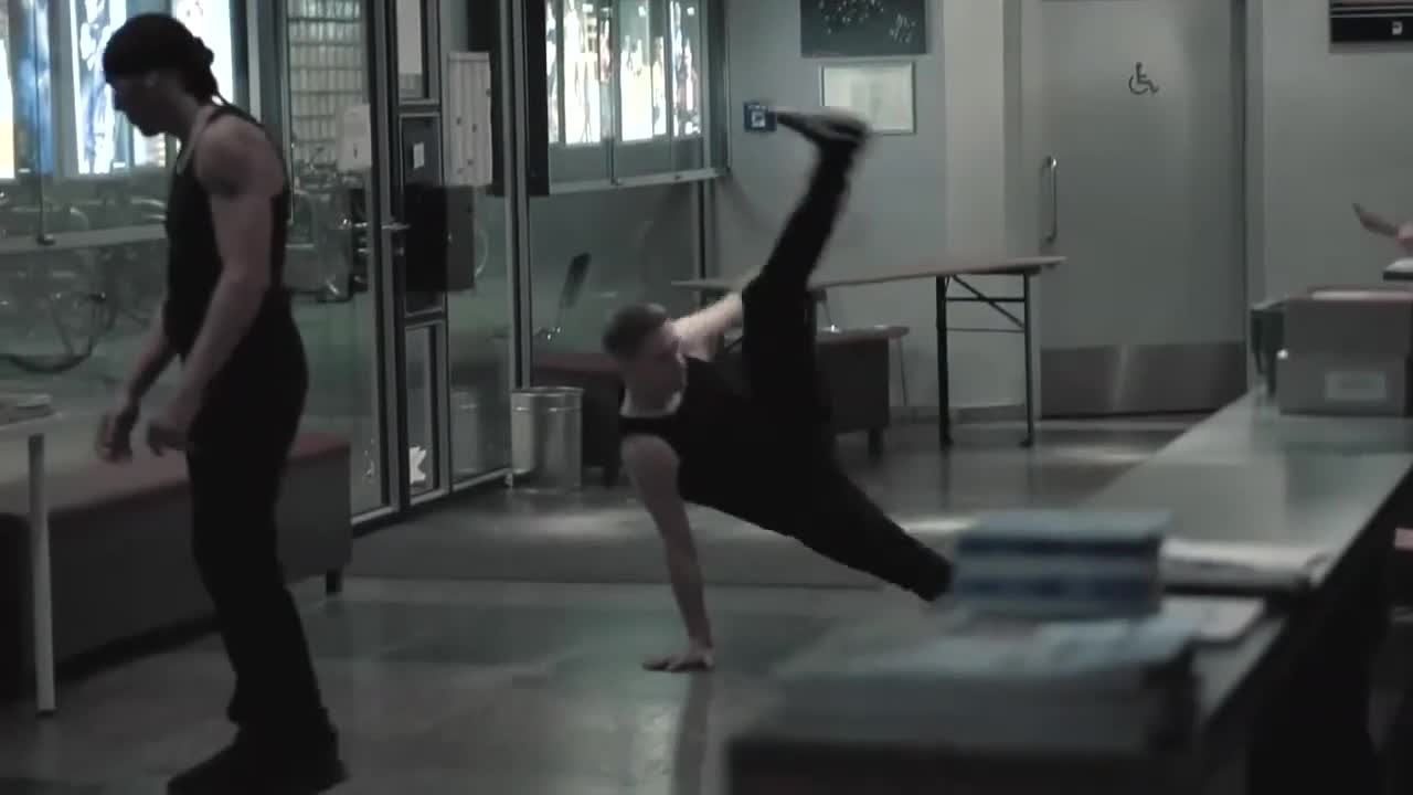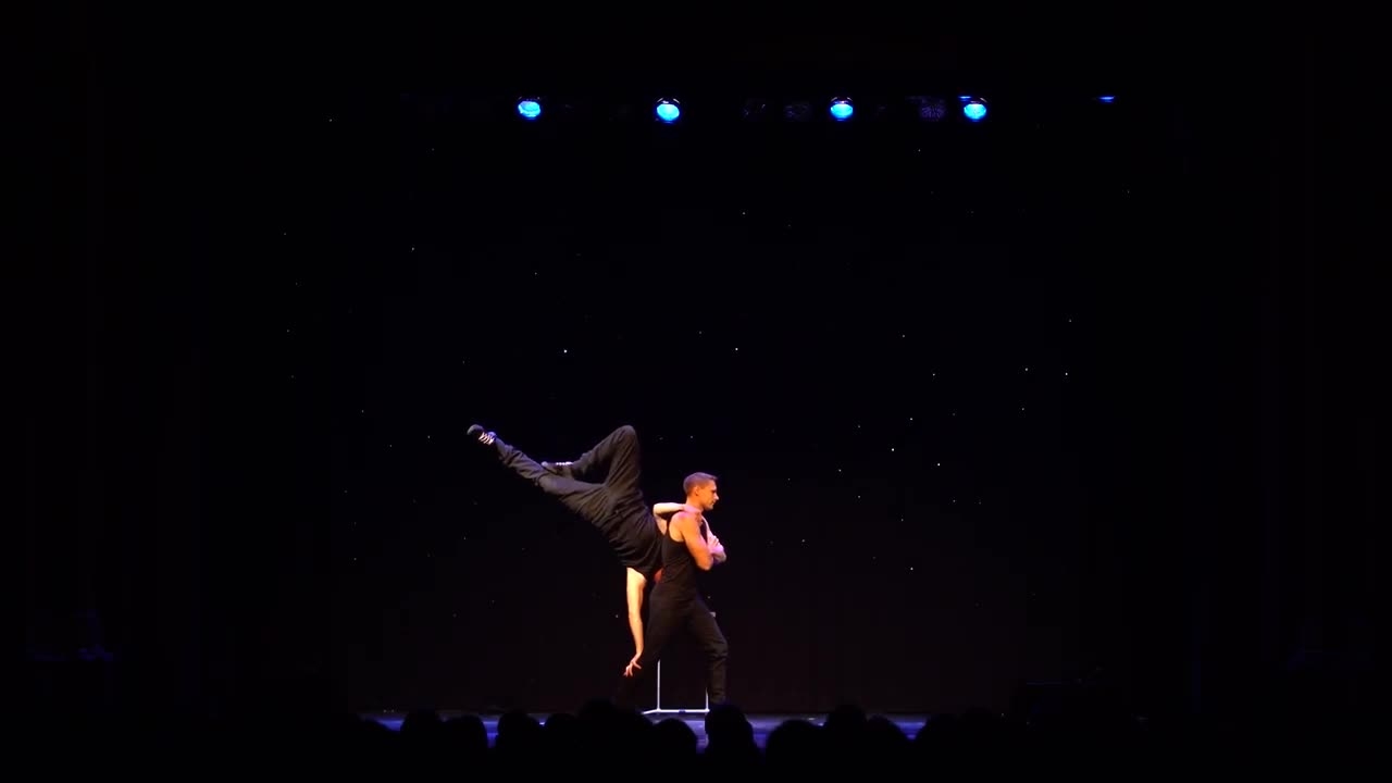 " Le duo [Breakdance & Acrobatics Duo] séduit le public avec leur combinaison impressionnante et variée d'éléments de breakdance et d'acrobaties. Ils font des équilibres sur la tête, s'entrelacent, puis se démêlent élégamment : ces deux hommes possèdent clairement une force et un équilibre supérieurs à la moyenne. "