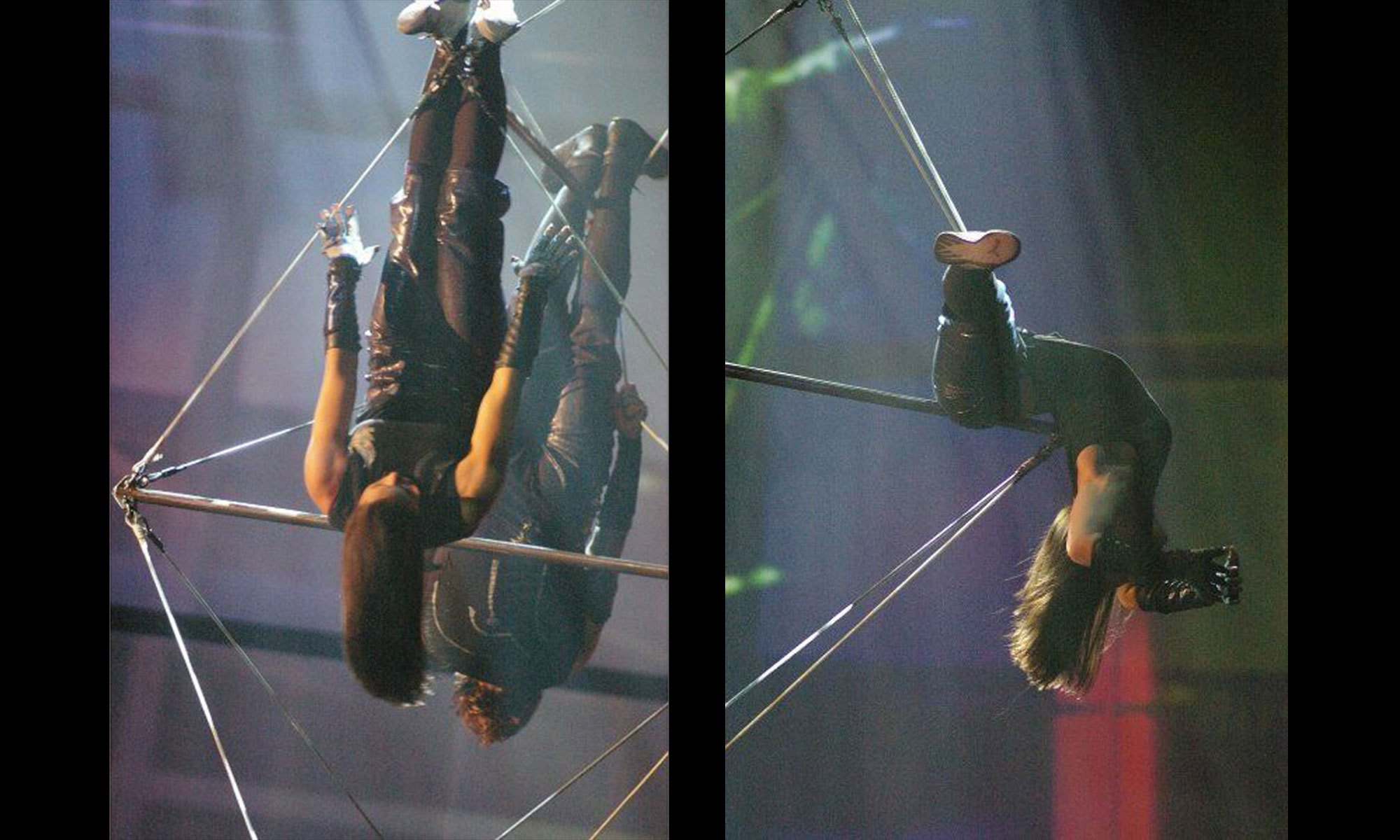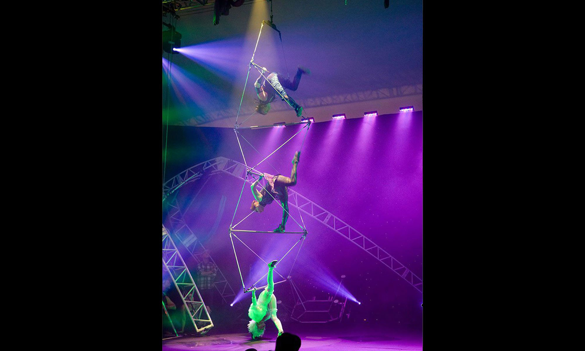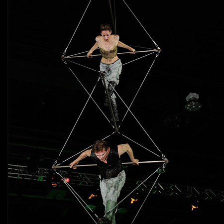 La scène de ce spectacle aérien est une délicate collection de barres et de câbles qui atteignent jusqu'à 34 pieds de longueur et laissent les acrobates suspendus dans les airs jusqu'à 40 mètres de hauteur. Nos talentueux acrobates aériens se déplacent sans effort le long de la longueur impressionnante de notre incroyable échelle aérienne en utilisant les câbles, les barres et les uns les autres pour influencer leur mouvement.