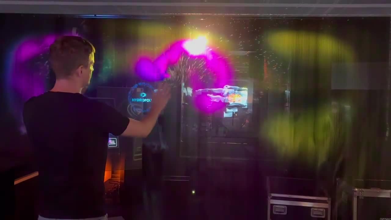 L'installation artistique interactive et futuriste projette des visuels sur une fine surface de brume, permettant aux invités de marcher à travers sans se mouiller.