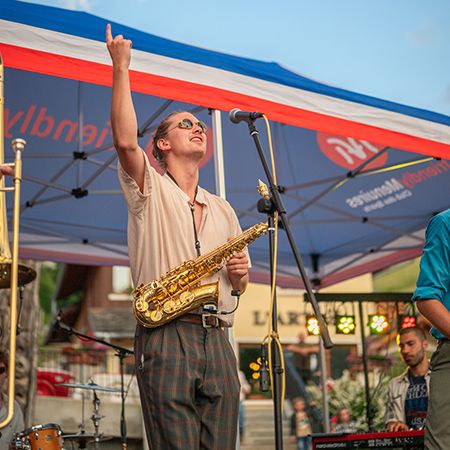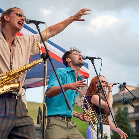 Cette bande animée et évolutive de huit musiciens propose des ensembles haute énergie qui plaisent aux publics jeunes et moins jeunes. Ils peuvent également déambuler dans l'espace de votre événement.