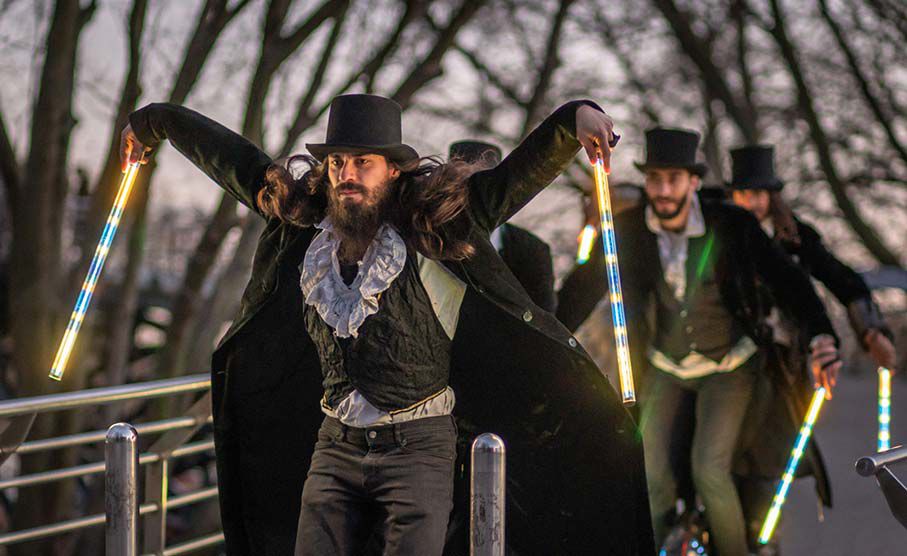 Nos jongleurs de monocycle à LED sont disponibles en formations flexibles avec jusqu'à huit artistes attrayants pour déambuler lors de votre événement et interagir avec les invités.