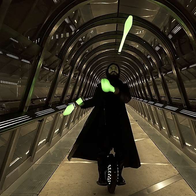Nos jongleurs LED montent des monocycles électriques futuristes, un site accrocheur, ils semblent être sortis d'un monde de science-fiction pour venir à votre événement.