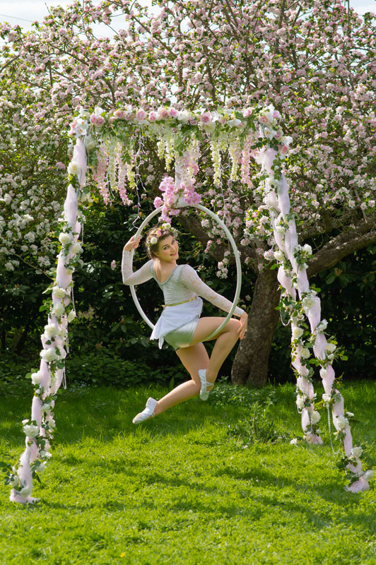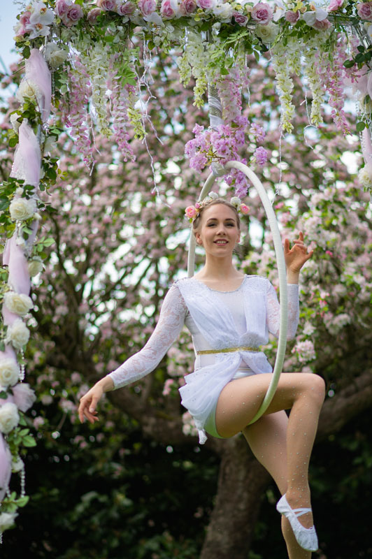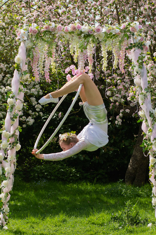 La beauté, la grâce et un peu de magie de cirque - suspendus dans un cadre entrelacé de roses blanches, de filet rose et de feuilles vertes, nos danseurs aériens enchanteront vos invités avec leurs magnifiques démonstrations de compétence et de flexibilité.