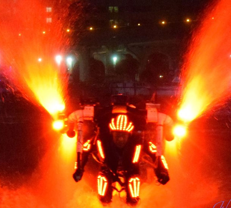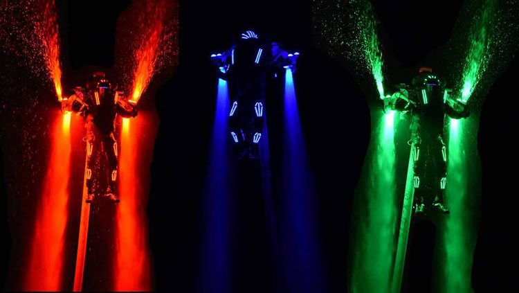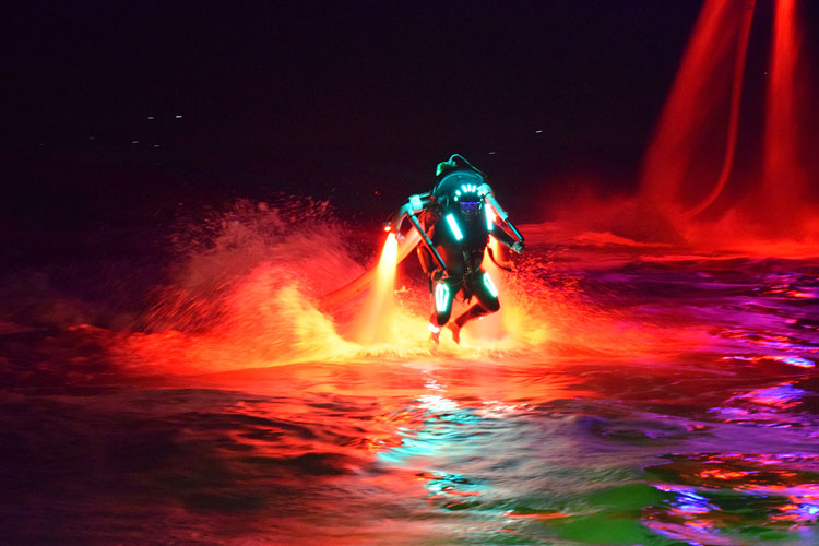 Grâce à l'utilisation de leurs jetpacks à LED étanches, cette performance ressemble à des héros de la vie réelle alors qu'ils plongent dans l'eau, émergeant tels un phénix couvert de spectacles incroyables de lumières LED colorées et de rayons lumineux.