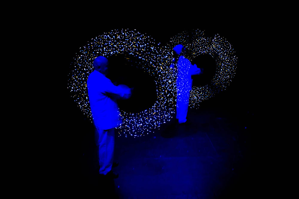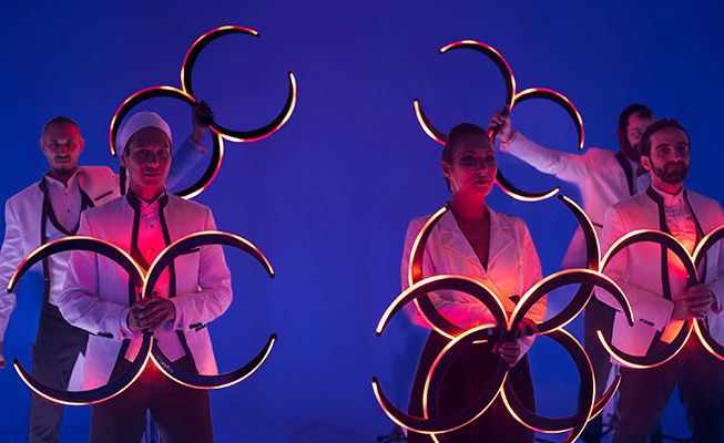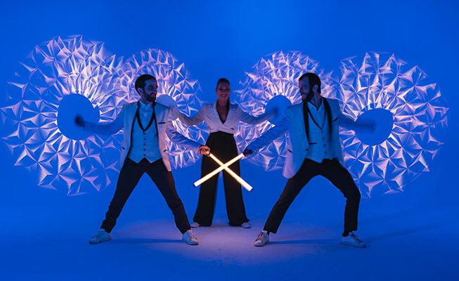 Ils ajoutent un élément visuel supplémentaire à leurs performances en portant des costumes blancs unis, qui deviennent une toile vierge, reflétant subtilement les couleurs de leurs outils illuminés. Rapides comme l'éclair, ces jongleurs de classe mondiale créeront un kaléidoscope de lumière et de couleur, créant un impact visuel incroyable qui ne sera pas oublié.