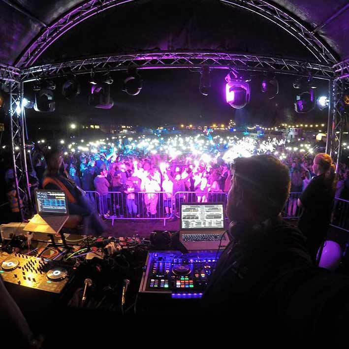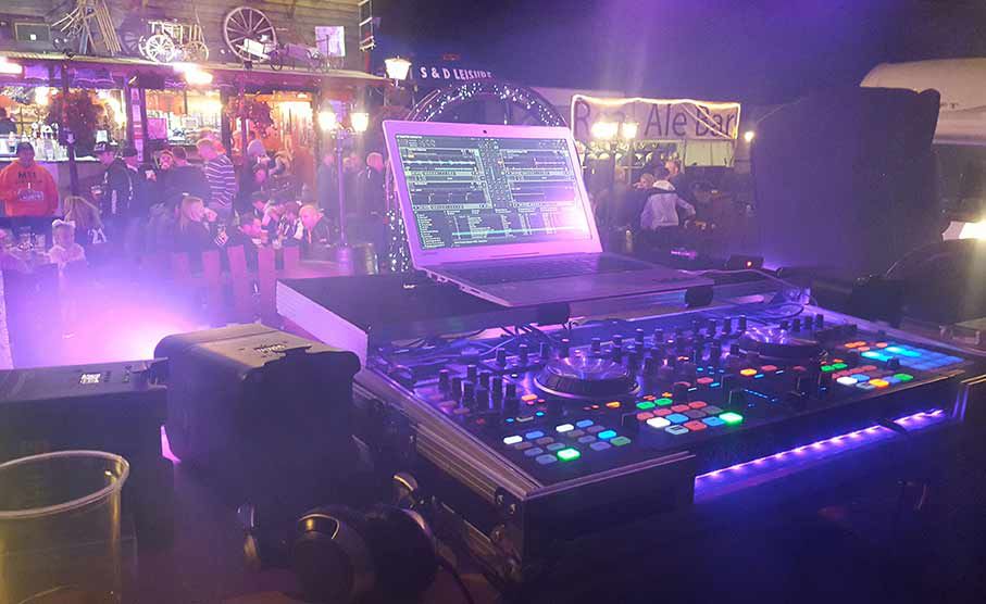 Le stand comprend un DJ ainsi qu'un éclairage informatisé et des lasers qui aident à créer l'ambiance pour ces célébrations nocturnes.