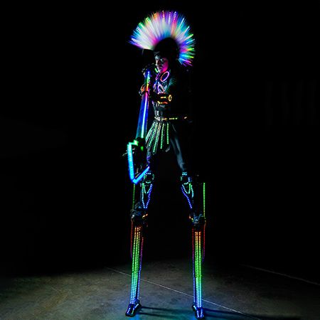 Incorporant une esthétique Punk contemporaine avec une crête géante en LED, ces échassiers frappants font sensation à chaque événement.