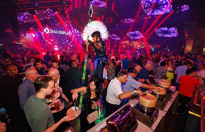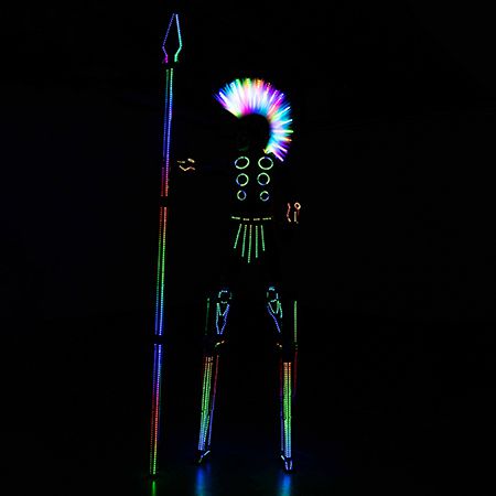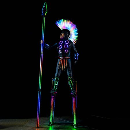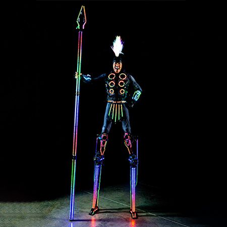 Nos échassiers inspirés des guerriers romains à LED, qui se mélangent et se mêlent, ne manqueront pas de faire sensation en se pavanant dans le lieu avec des lances lumineuses.