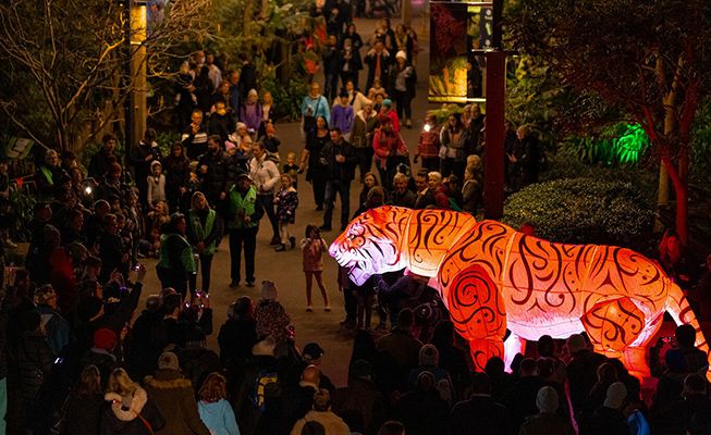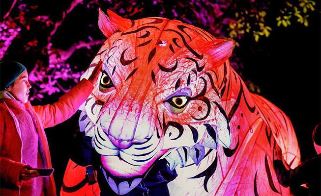 Pendant la nuit, cette marionnette étonnante est illuminée par des LED. Le tigre géant peut également servir d'installation statique où les lumières changent de couleur au rythme de la musique.