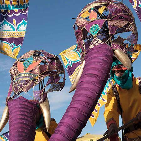 Cet acte de déambulation magnifique met en scène notre marionnette géante indienne, Padmini, accompagnée de ses incroyables marionnettes d'éléphants indiens sur échasses.