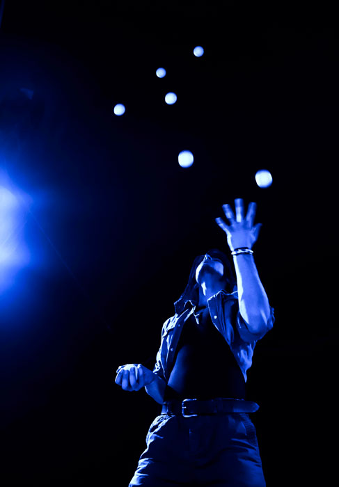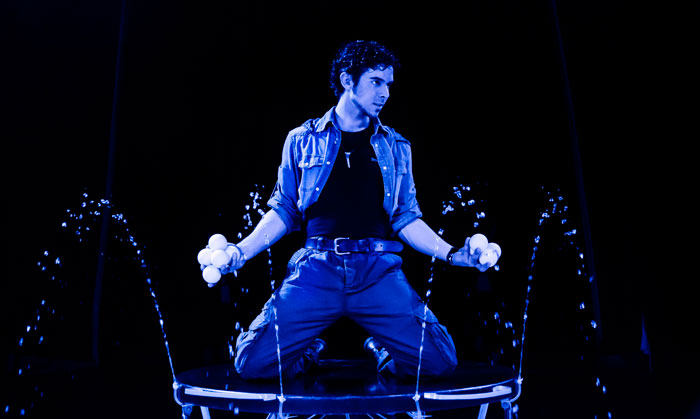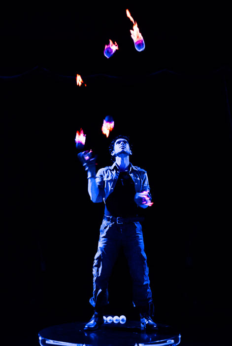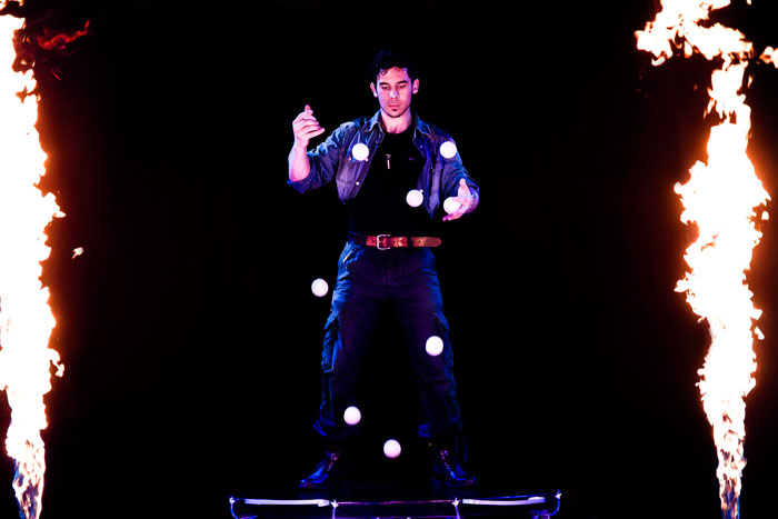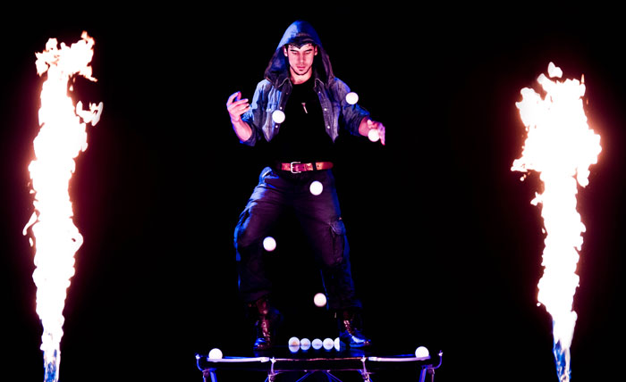 La spécialité absolument époustouflante du jongleur Multiball Budapest primé est de jongler avec cinq à dix balles en les lançant vers le haut et vers le bas, en rebondissant les balles sur son podium. Sa plateforme sur mesure éjecte de l'eau et il y a des jets de flammes de chaque côté, ce qui donne vraiment au spectacle de jonglerie une dimension de divertissement haut de gamme. Il termine cet acte de scène en jonglant avec des balles de feu.