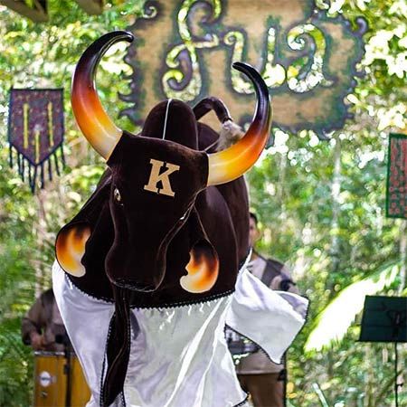 Célébrant la légende du bœuf ressuscité, nos artistes endossent les rôles de Boi Guarantido et Boi Caprichoso, dans un spectacle musical extravagant.