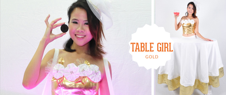 Les Table Girls sont parfaites pour les soirées cocktail - spécialement conçues pour que les table girls puissent se déplacer dans l'événement. Elles peuvent personnaliser les costumes selon votre thème ou votre concept et constituent un ajout élégant à tout événement avec canapés.