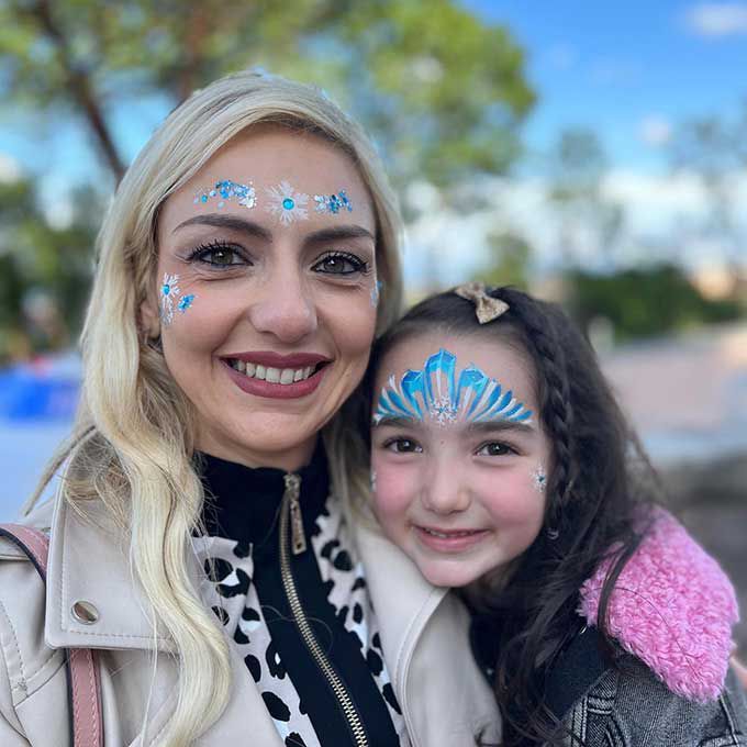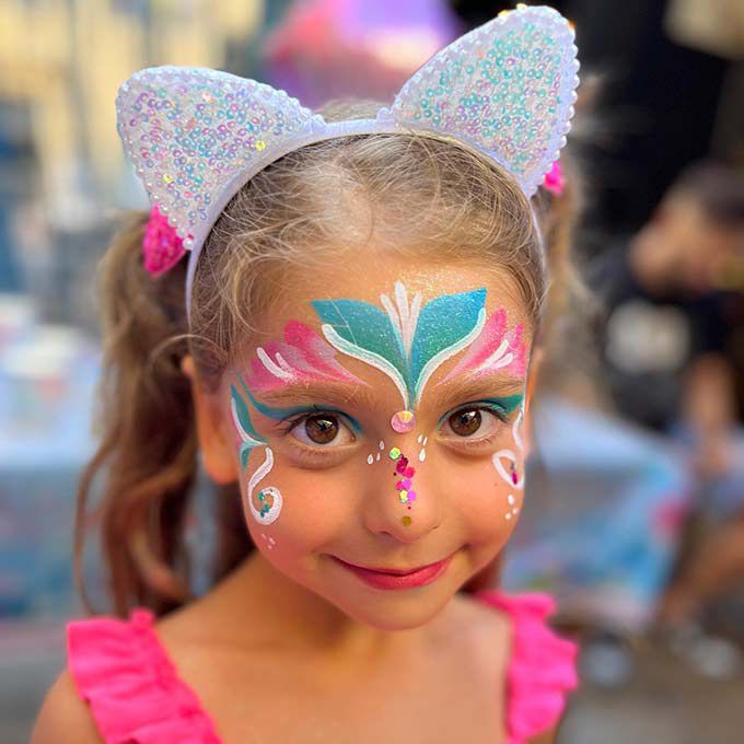 Fournissant de la peinture pour le visage aux couleurs vives, des paillettes et des bijoux, notre artiste propose un choix de designs rapides et amusants ou plus complexes.