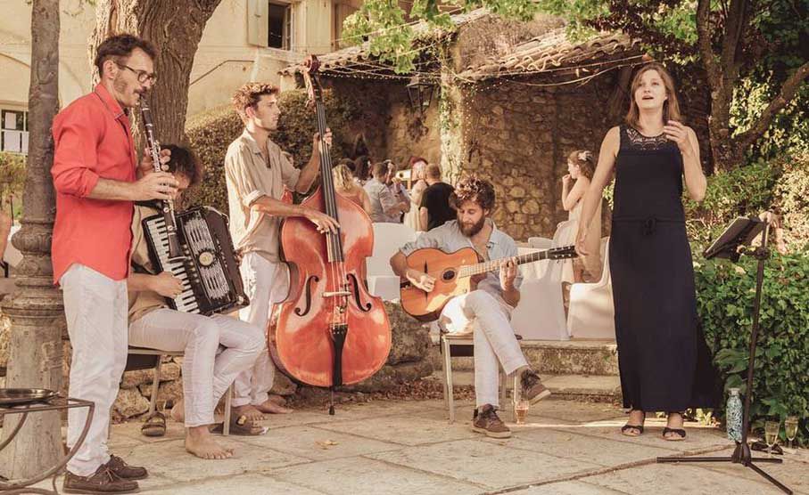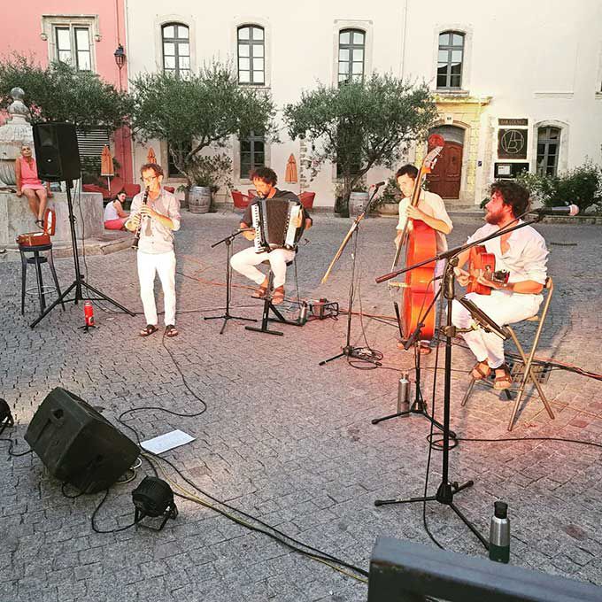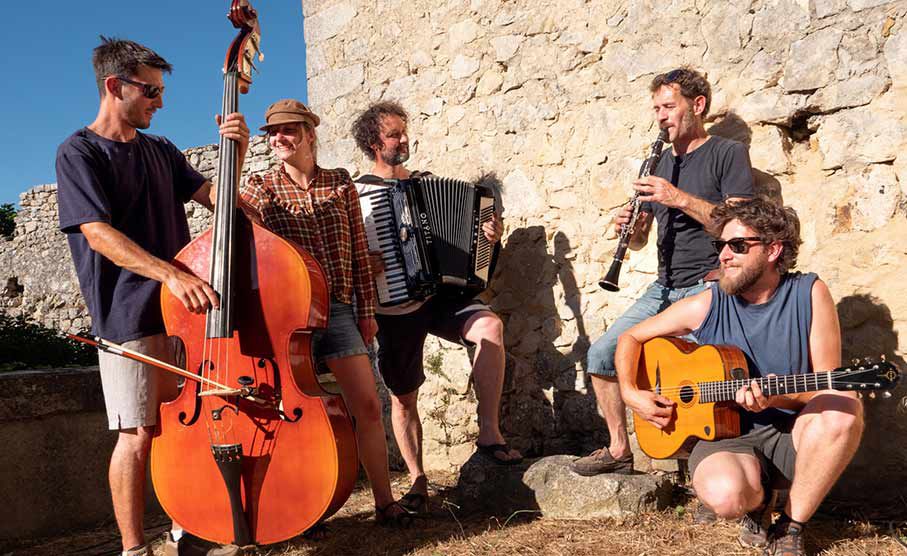 Cette formation acoustique de cinq musiciens est originaire du sud de la France et comprend une guitare, un accordéon, une clarinette, une contrebasse et un cajón.